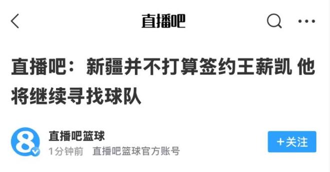 早在九月初的时分,媒体就曝出了王薪凯在新疆男篮试训的音讯。随后球队主教练刘炜在接受采访时也泄漏过,王薪凯有能够会加盟球队,新疆男篮有意在11月份的球员转会窗口期里和他完成签约。不过随着新疆队阵容的日趋完整,主教练刘炜也对球队阵容停止了综合评价,最终坚持了签约王薪凯的想法。目前王薪凯曾经分开了新疆男篮,将会去其他球队经过试训寻觅再失业时机。