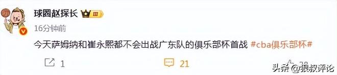 依据媒体人“球圈赵探长”报道,明天萨姆纳和崔永熙都不会出战广东队的俱乐部杯首战。