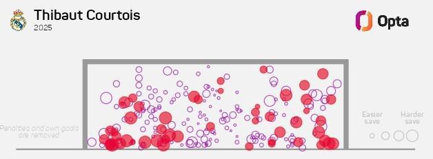 据统计,在2025年的欧洲五大联赛中,没有任何门将,在所有比赛中,能比皇家马德里的门将库尔图瓦(174次扑救)做出更多的扑救。