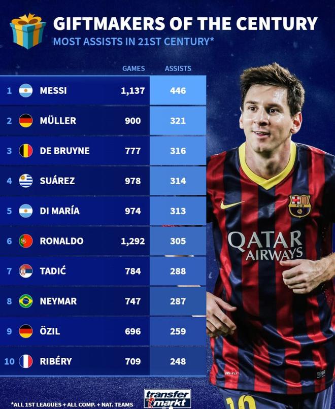 北京时间12月25日,德转统计出了21世纪世界足坛顶级联赛俱乐部+国家队各项赛事助攻次数最多的10名球员,梅西以446次助攻高居第一,托马斯-穆勒321次第二,德布劳内316次第三,C罗305次排名第6。