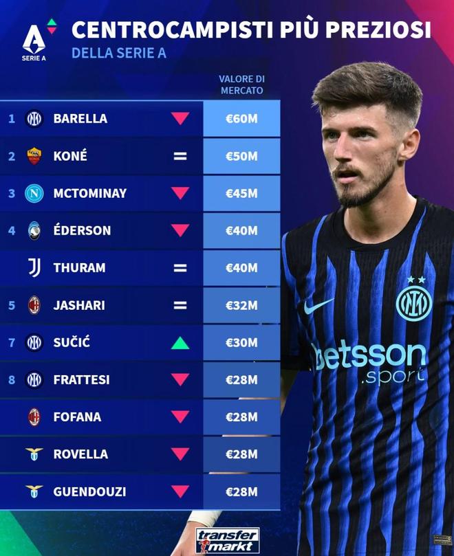 北京时间12月27日,德转列出了球员身价更新之后,意甲中场身价TOP10,巴雷拉6000万欧元排名第一,夸迪奥-科内5000万欧元第二,麦克托米奈4500万欧元第三。