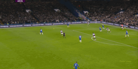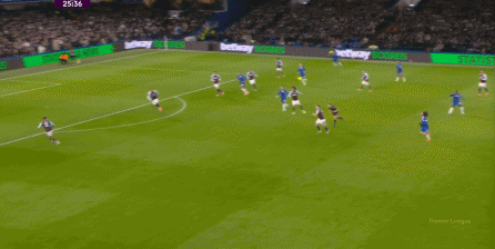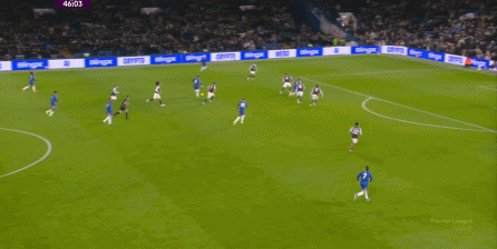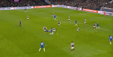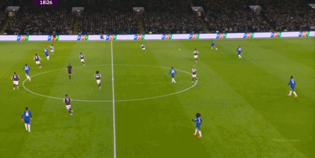 这样一来,林德勒夫的弱势就会带动身前和身侧的球员一起退缩,边后卫、边前卫,中前卫都要跟着塌,切尔西便很容易能通过球员压上和无球跑动,制造出从这一侧起脚传中的空间: