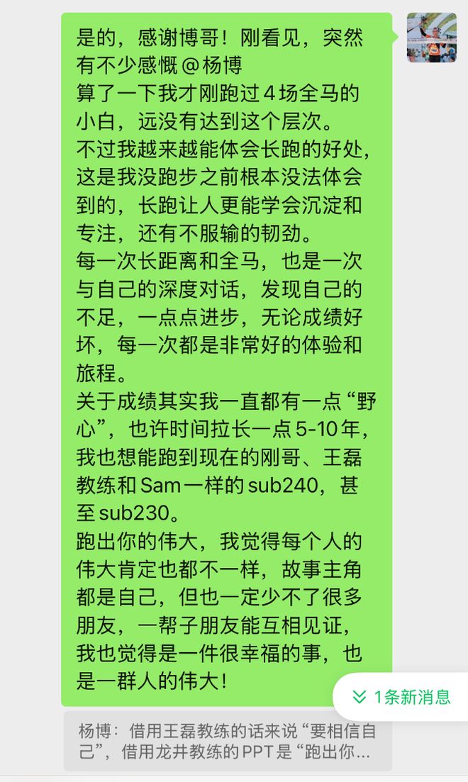 感谢我的一切教练们,特别是龙井教练,由于在赛前对自己的形状基本有认知,99%是PB不了的。赛前几周的延续作战,倒数第二周的强度,虽然也按期减量调整,但形状却越来越差。为什么还有1%呢?由于关于既定好的目的,怎样也要大声说出来,并且只需站上了赛道,我也永远置信那个勇于动身和应战的自己。真不行,也得跑完再说不行。