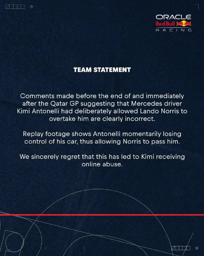 眼看言论逐渐失控,红牛车队宣布官方声明,廓清了此前的言论。“那些在卡塔尔大奖赛完毕前后宣布、暗示梅奔车手安东内利故意让诺里斯超车的言论显然是错误的。”马尔科自己也收回了之前的说法。“我再次细心观看了录像,第一次看时,我觉得安东内利本可以更好地守住位置。但第二次看,我发现这是一次驾驶失误,而非故意行为。”