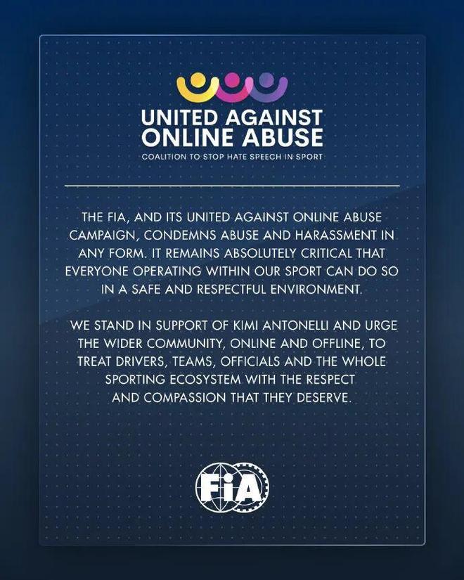 国际汽联也宣布声明,明白表示“谴责任何方式的辱骂和骚扰”,并强调“最重要的是,每位在我们这项运动中任务的人都可以在平安、尊重的环境中任务。”