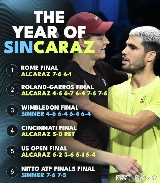 三次大满贯、两次巨匠赛和都灵年终总决赛,阿尔卡拉斯和辛纳本赛季在六场决赛中相遇,简直统治了整个赛季。辛纳看起来简直无人可挡,他只输给过两团体:阿尔卡拉斯和布勃利...发表于:12月05日 -