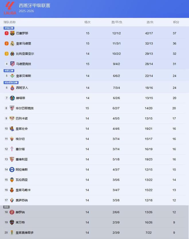 西甲巴塞罗那比利亚雷亚尔毕尔巴鄂竞技马德里竞技皇家马德里巴列卡诺塞尔塔皇家贝蒂斯赫塔费埃尔切马洛卡奥萨苏纳阿拉维斯莱万特皇家奥维耶多皇家社会塞维利亚西班牙人赫罗纳瓦伦西亚