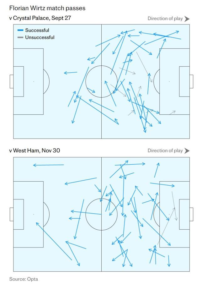 在无球时,利物浦也能以更多人数包围对手实施反抢。一个幽默的数据是:维尔茨本场在进攻三区及传入禁区的关键传球数,其实与他本赛季的平均水平相近(他仍在等候英超初次助攻)。但这并不能反映他本场竞赛在速度、决策准确性和身体对立上的片面提升。